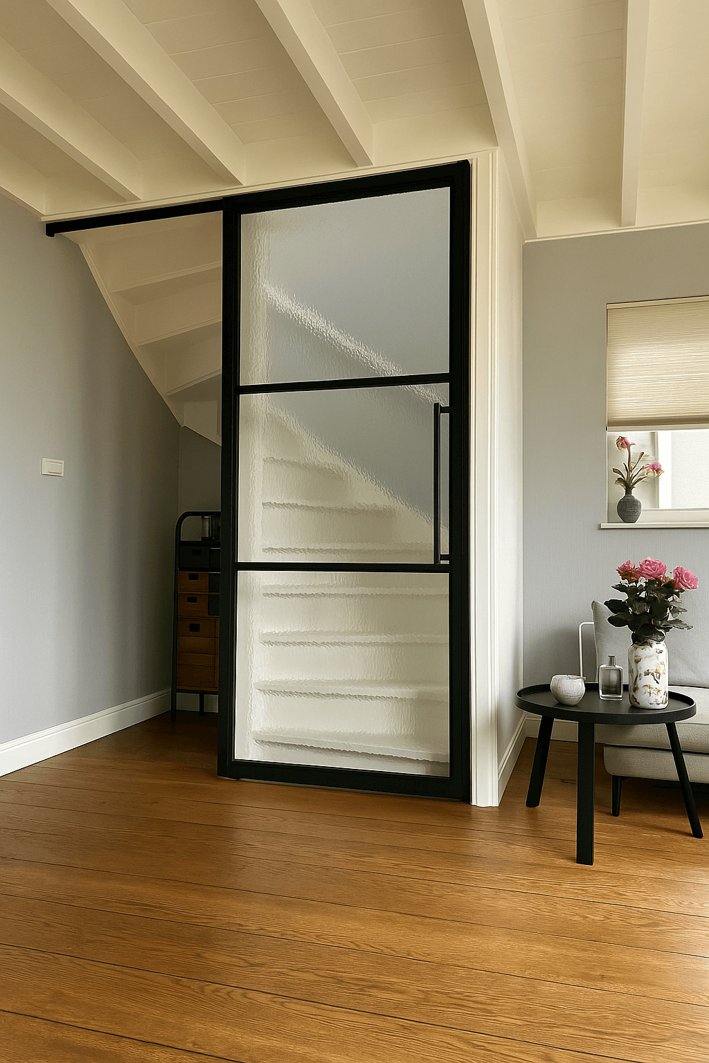 De schuifdeuren van Barnwoodweb combineren industriële charme met verfijnde afwerking. Het glas zorgt voor transparantie, terwijl het stalen frame een krachtig lijnenspel toevoegt aan het interieur. Zo creëer je een open, moderne uitstraling met behoud van privacy en licht.