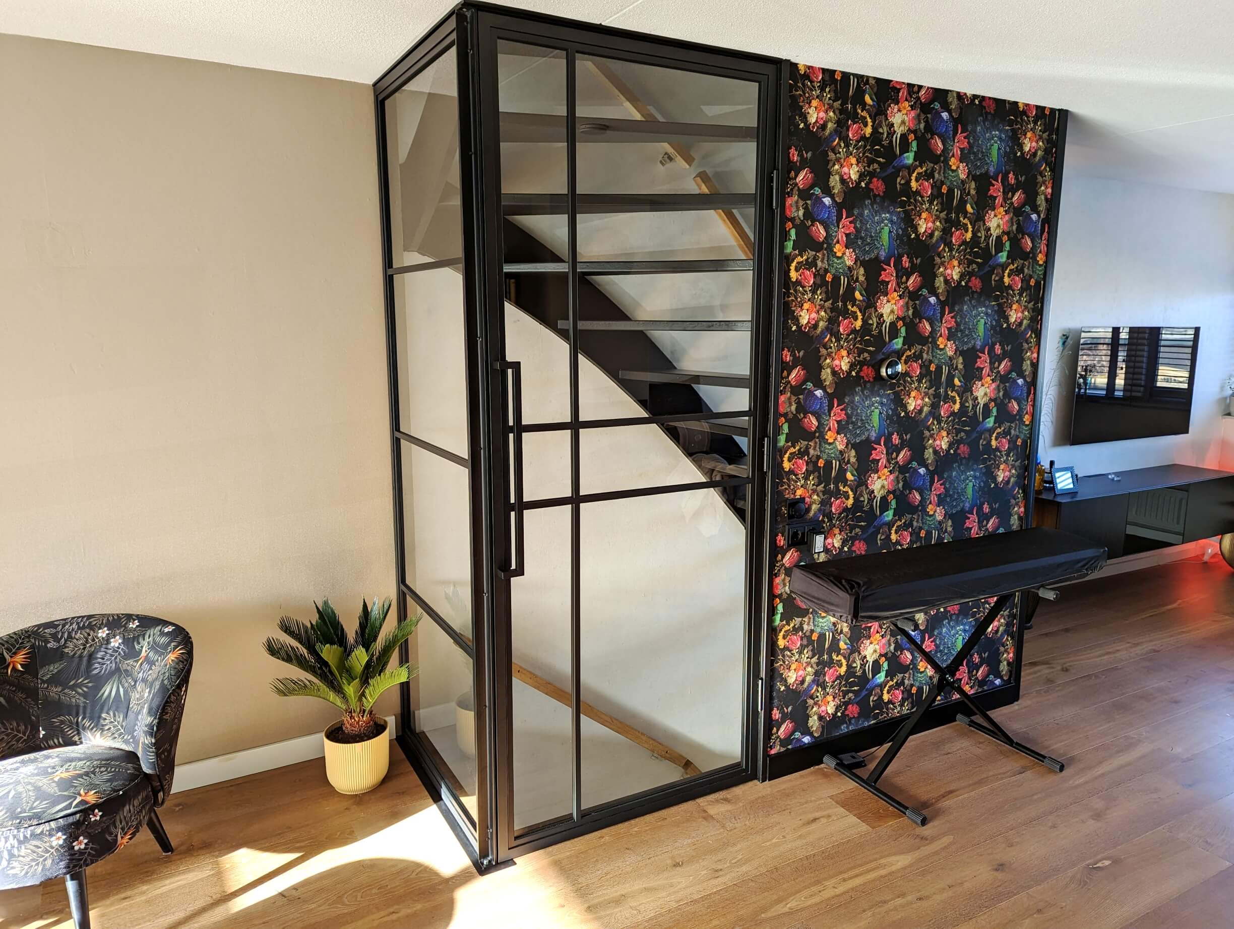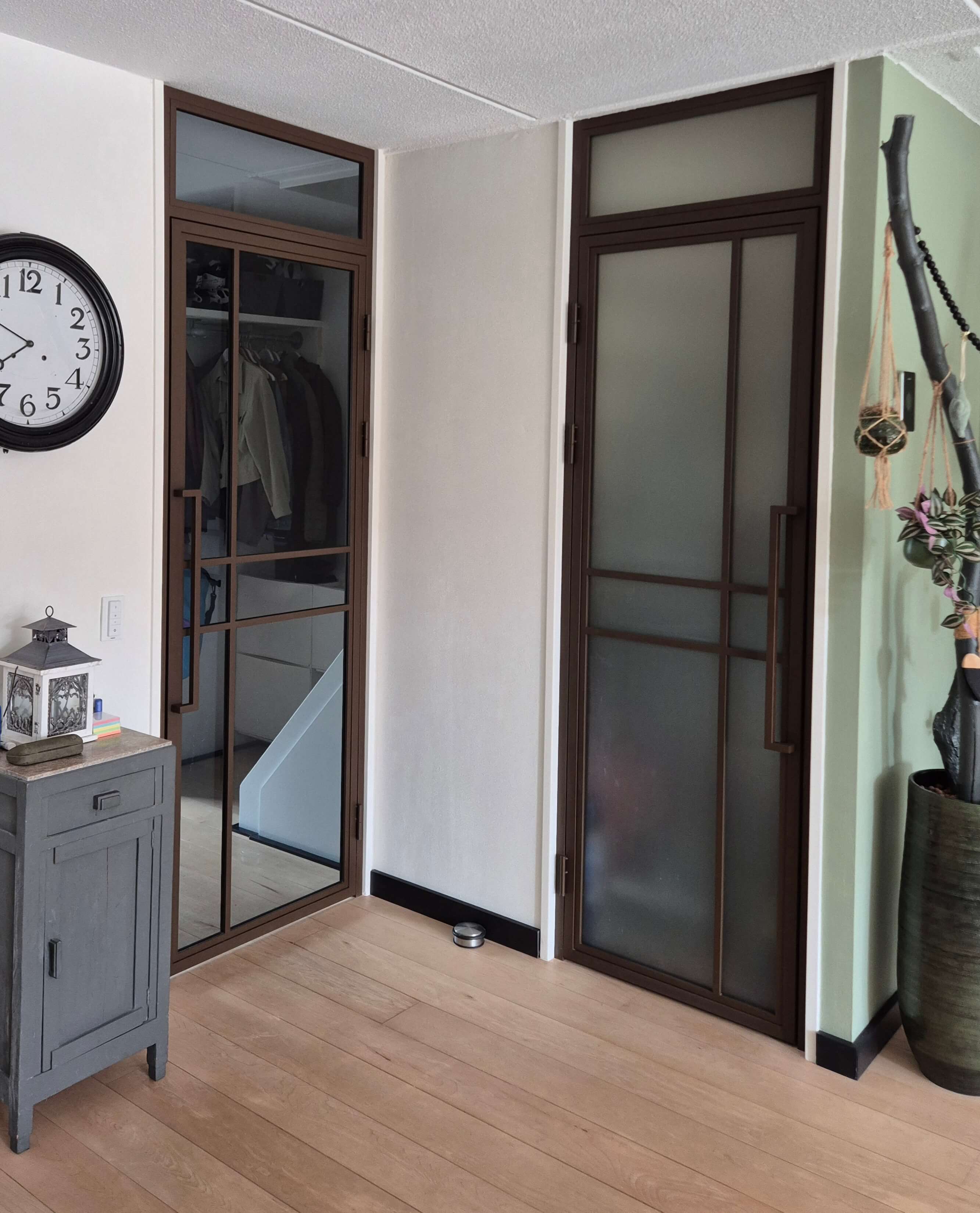 Kies bijvoorbeeld voor helder glas als je een open, lichte sfeer wilt, of voor rookglas om net wat meer privacy te creëren zonder dat het donker wordt. In kleinere ruimtes – zoals een hal, slaapkamer of kantoorhoek – zorgt een stalen deur met glas voor extra diepte en lichtinval.