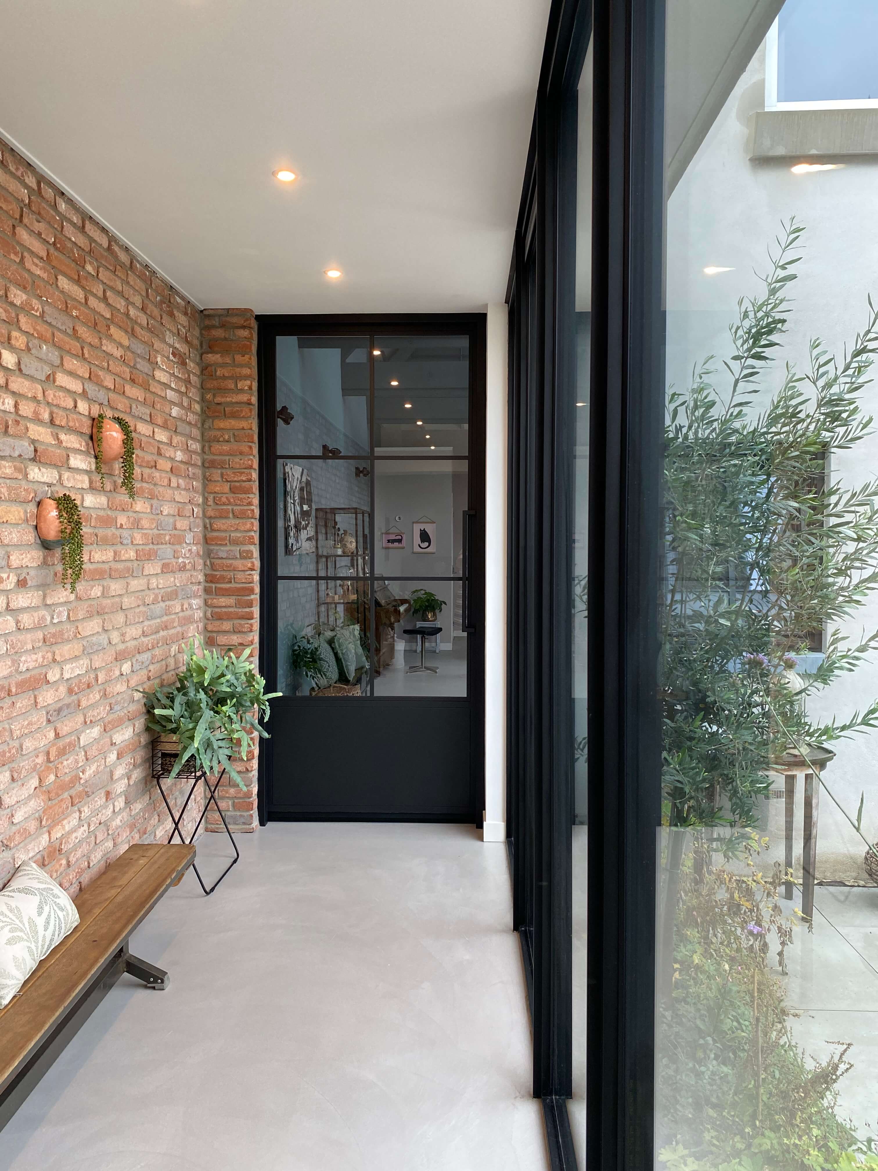 Een dubbele stalen deur naar het terras of een schuifdeur met glas versterkt het gevoel van ruimte en brengt de natuur dichterbij. Zeker in combinatie met veel groen, lichte muren en natuurlijke materialen zorgt dit voor een rustgevende, bijna loft-achtige uitstraling.